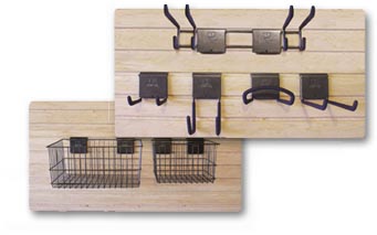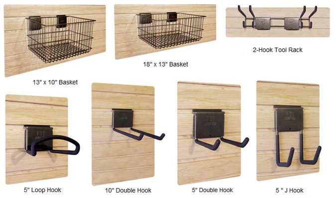 Endless Possibilities... Slat-Wall is the perfect addition to your garage. Whether above your workbench or on a wall, 5 Slat-Wall Hooks and 2 Slat-Wall baskets give you the ultimate in storage flexibility. 18" x 13" Basket 13" x 10" Basket 2-Hook Tool Rack 10" Double Hook 5" Double Hook